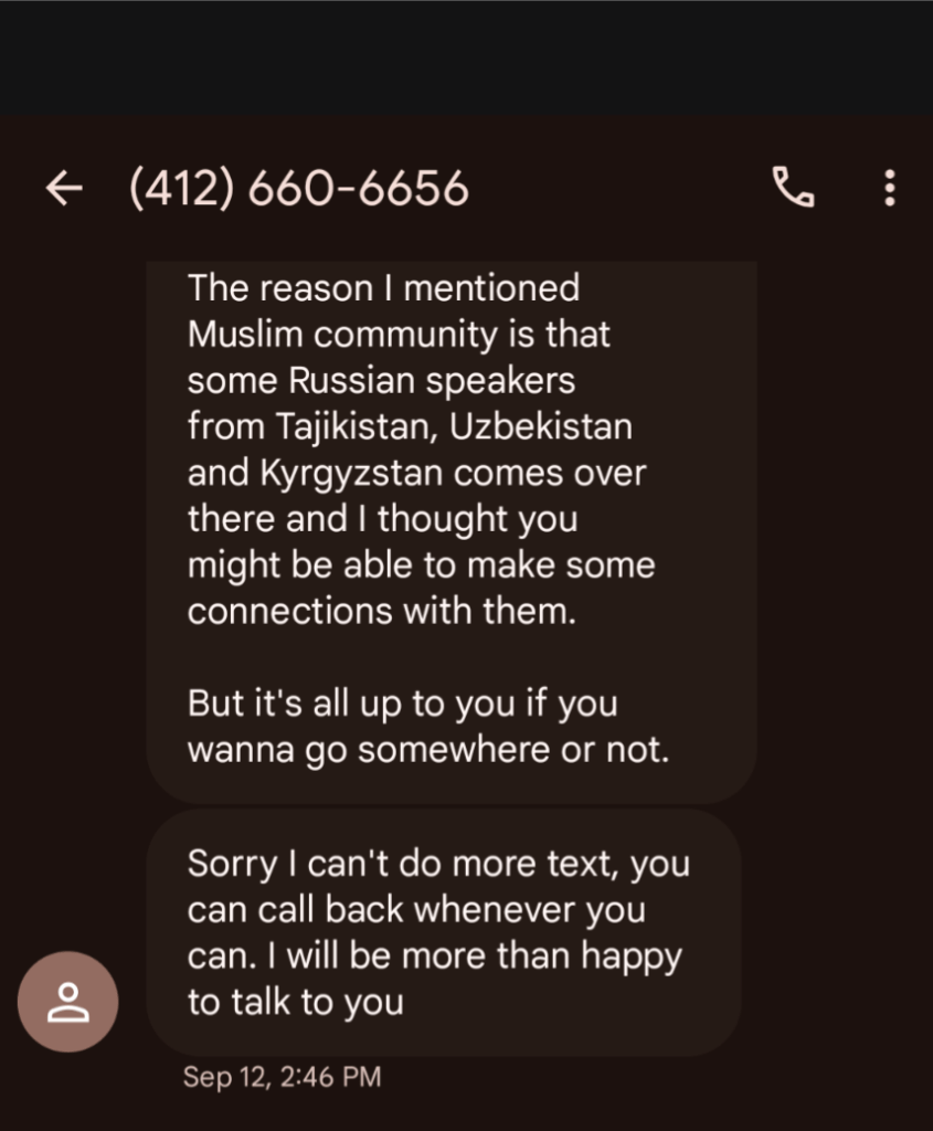 When Zubair from ISAC, which is part of JFCS Pittsburgh PA USA organization, was not able to get a hold of the person from Eastern Europe. The interpreter they used in the voice mail left, which was not transcribed well in the image below, learned that the person from Eastern Europe visits the Starbucks under State Representative Dan Frankel’s office.