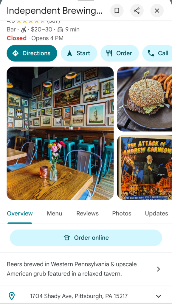 A person from Europe visited this pub and restaurant in Squirrel Hill of Pittsburgh PA USA, The Independent Brewing Company, in the neighborhood hood of Carnegie Mellon University and University of Pittsburgh.